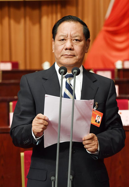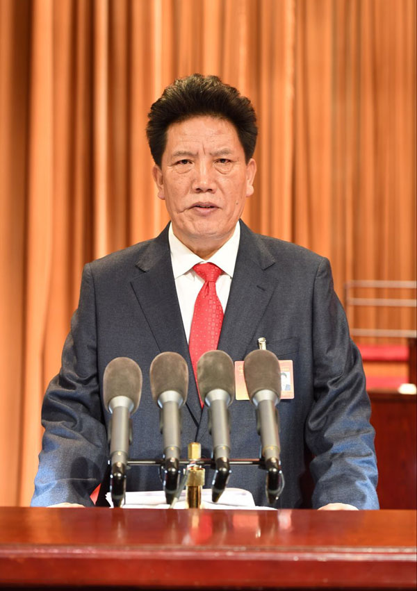 受自治区十届人大常委会委托,洛桑江村向大会作自治区人大常委会工作报告。